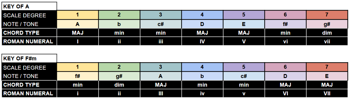 KEY OF A MAJOR : A , B , C# , D , E , F# , G# / KEY OF F# MINOR : F# , G# , A , B , C# , D , E