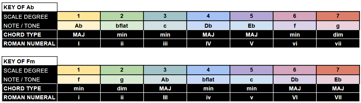 KEY OF Ab MAJOR : Ab , Bb , C , Db , Eb , F , G / KEY OF F MINOR : F , G , Ab , Bb , C , Db , Eb , F , G