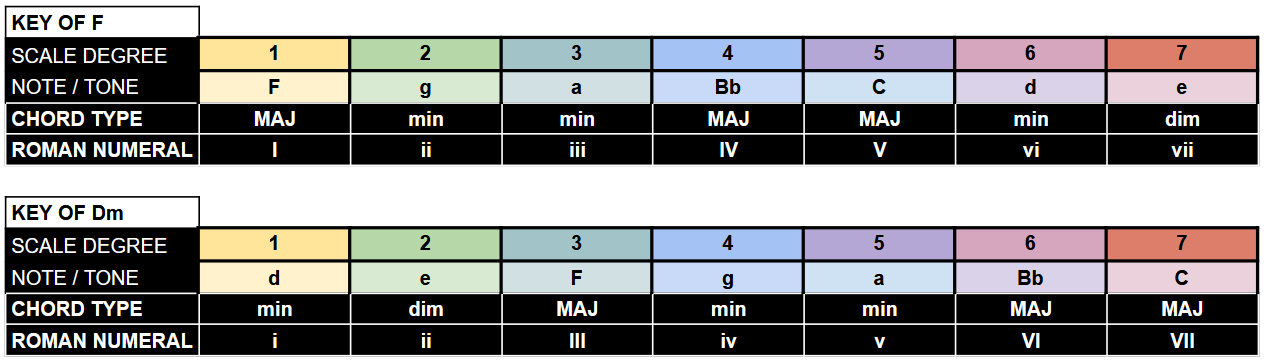 KEY OF F MAJOR : Bb , C , D , Eb , F , G , A / KEY OF D MINOR : G , A , Bb , C , D , Eb , F